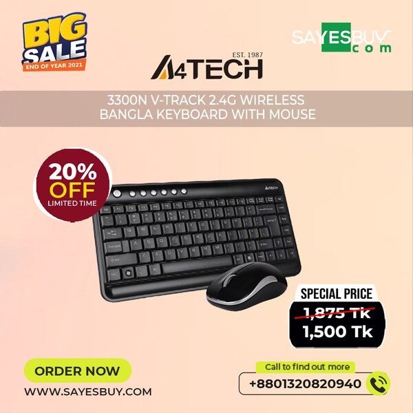 A4TECH 3300N Wireless Keyboard With Padless Mouse