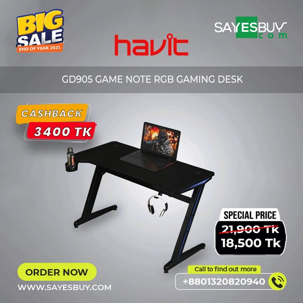 Havit HV-GD905 RGB Lighting Gaming Table featured with Aluminum Alloy Panel, Double Layer Canvas, RGB 7 Colorful LED Lighting and Aluminum Tripod Design, Sturdy Durable with Massive Wire Management. This gaming chair comes with Premium ABS+Composite Board, Steel Rod Frame materials with 120 x 60 x 74cm size. The Havit HV-GD905 RGB Lighting Gaming Table has no warranty.